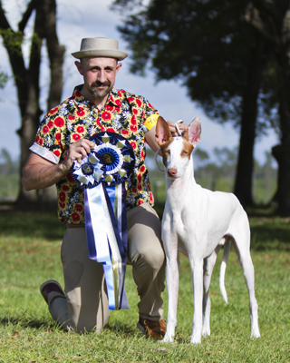 Beetlejuice is from the Winter 2021 "Star 3" litter between Jovian and Maia. He lives here in Florida and made his debut at 6 months and a few days old winning Best of Winners 4 days in a row for 13 points with 3 majors! His next weekend out he was Best of Winners 2 out of 3 days and earned his championship before turning 7 months of age! At only 10 months old, Beetlejuice won Select Dog at the 2021 AKC Royal Canin National Championship! At just over a year of age, he has begun his lure coursing career and in his first 6 trials, he earned his senior courser title, 2 legs toward his master courser title and 5 points with a major! At 15 months of age, Beetlejuice and his owner Joseph won a Best in Show and Reserve Best in Show at the International All Breed Canine Association shows in Brooksville, FL! At 16 months old, Beetlejuice earned his field and dual championships and shortly after became the 30th Abbaio Grand Champion! At his first NLCC in December 2022, Beetlejuice won the Specials A stake on day 1! A year after beginning his lure coursing career, Beetlejuice earned his lure courser excellent title to become the 3rd Abbaio-born LCX! 5 weekends later, he earned his LCX2 title and is the first Abbaio Ibizan to accomplish this achievement! He earned his first Best in Field in October of 2023, the 14th Abbaio-born Ibizan to win a BIF! Beetlejuice is a medium-sized, moderate male with great bone and a terrific attitude. He is a total clown who loves hiking as much as he loves napping. At the 2023 AKC National Lure Coursing Championship, Beetlejuice won his stake on day 2, tied for the next highest scoring Ibizan which qualified him to run as a breed finalist toward Best in Event where he placed 2nd in breed. He was the highest scoring Ibizan Hound dual champion, and along with his cousin Json he won the Ibizan Hound Breeder Stake for Abbaio for the 3rd time! Beetlejuice ended the 2024 lure coursing year as the #1 Ibizan Hound in AKC Lure Coursing and was the #4 of all sighthounds!