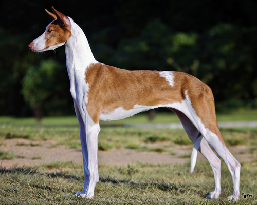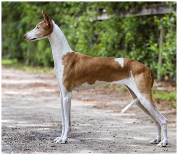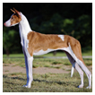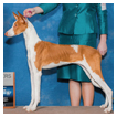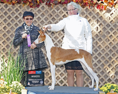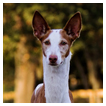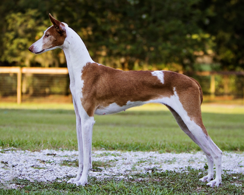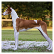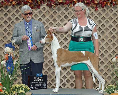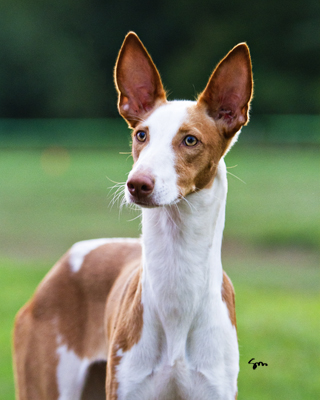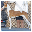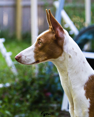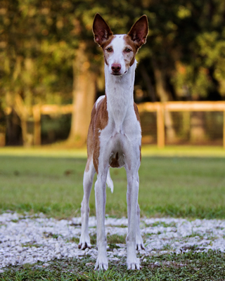 Maia is from the Summer 2013 "Star" litter between Orion and Stella. She was pointed out as a puppy and was then only shown sparingly over the years as she matured. She finished her championship at a little over 5 years old picking up back-to-back majors! Maia is a very sweet and goofy girl who has a really funny--and very surprising--deep baratone bark! She has never met a stranger, either people or dogs, and is always happy. She tried lure coursing for the first time at 6.5 years old and really liked it, receiving her qualifying certificate to compete, and competed in her first trial in the veteran stake at 7 years and 22 days old where she won 1st place for a major! Just a few weeks later, Maia finished her dual chapionship with 4 majors! After several failed attempts at breeding, I had all but given up when my reproductive vet suggested we try one more time, and Maia whelped her first and only litter of two beautiful puppies at about 7.5 years of age. She was a fabulous mother and passed on so many of her wonderful traits to her puppies, both of which remained here, and shortly later retired to live with my friend Katie and her other Abbaio Ibizan, Marrow, who needed a companion! Maia occasionally gets to lure course but spends most of her time cuddling with her Lykoi cat.